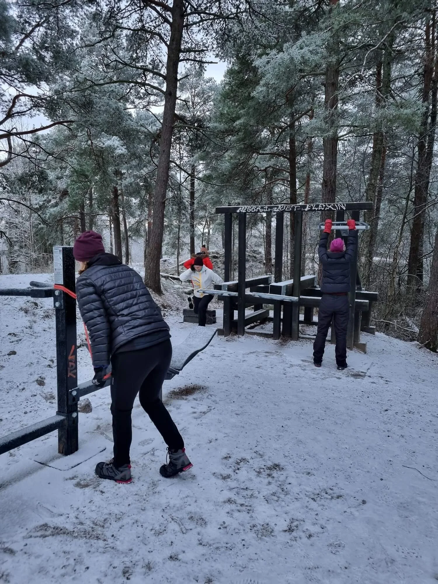 Kehitä voimaa lähiluonnossa! Ulkosalin laitteilla, tuomillani välineillä ja kehonpainolla tehtävä kiertoharjoittelumuotoinen voimapainotteinen treeni. Alkuun liikelaajuuksia palauttava sekä sykettä nostava lämmittely ja loppuun lyhyet venytykset. Liikkeistä saatavilla variaatioita. 5-8hlö.
